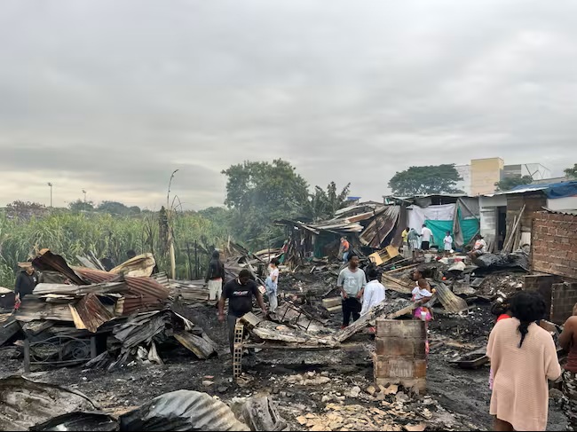 Bomberos Cali atienden emergencia incendio estructural 4 personas lesionadas y 40 viviendas destruidas.